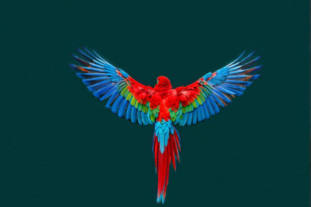 A close-up of a colorful parrotas feathers showcasing a vibrant mix of green, red, and blue.