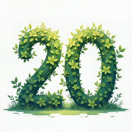 Greeting card for 20 years. A lush, green number 20 formed from leaves, vines, and grass, evoking a natural, earthy birthday theme.