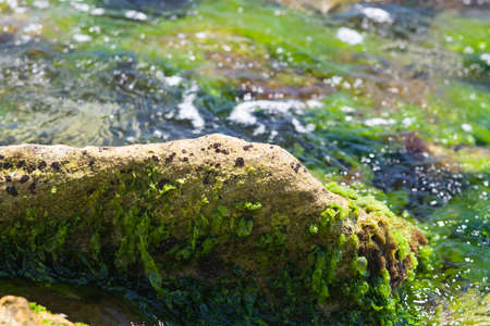 Stones overgrown with algae in the shallow water on the beach