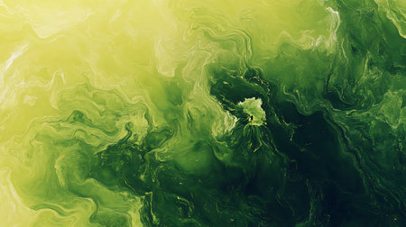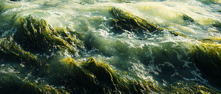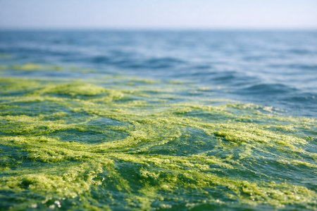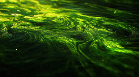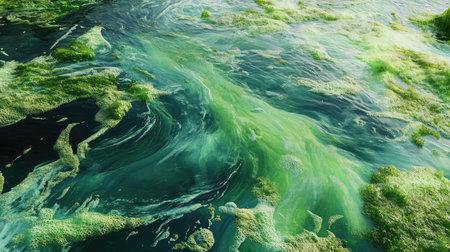 AI generated algae bloom spreading across ocean surface with green organic textures environmental pollution climate change marine ecosystem impact copy space