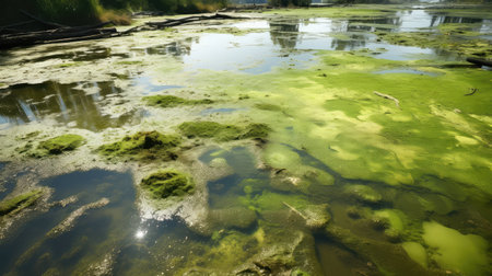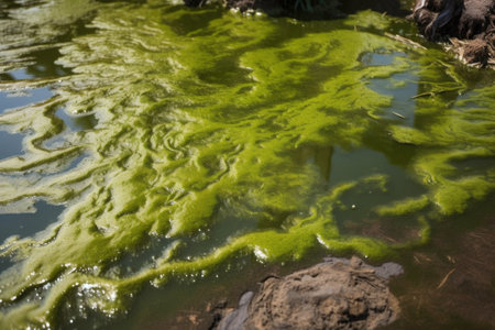 close-up of algae bloom in waterway caused by agricultural runoff, created with generative ai