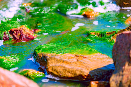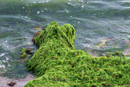 Sea green algae on the stones on the seashore.