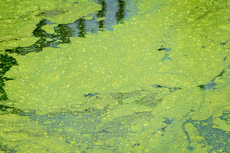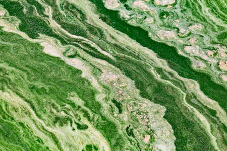 Green algae pollution on a water surface. Ecological concept
