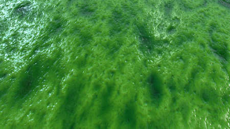 Algal bloom in water of Dnieper river in Ukraine. Green color of water caused by a rapid increase or accumulation of algae. Ecological disaster. Water pollution. Natural green abstract background