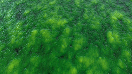 Patterns of green algae on the water. Green water. View from above. Algae. Background. Texture. Abstraction. Copy space