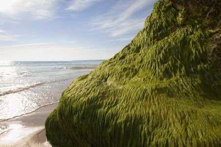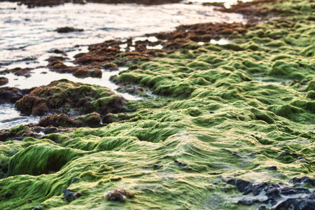 beautiful sea shore covered in vibrant green algae in autumn sunlight