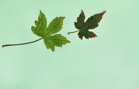 Season layout of summer and autumn leaves on mint green color. Nature background. Seasonal concept.