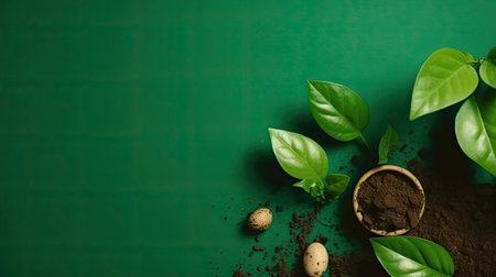 Beautiful Top View of Earth Day banner concept design of plants, plant seeds and miniature earth on green background