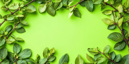 Flat lay of lush green leaves and flowers forming a natural frame on a vibrant green background.
