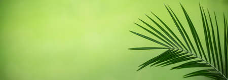 Tropical natural background with palm leaf on green. Flat lay, copy space