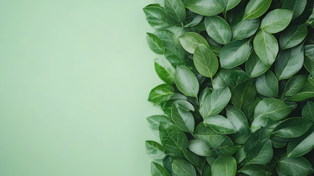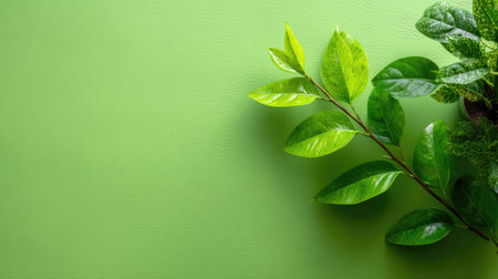 Lush green leaves set against a vibrant green background create a serene natural scene,.