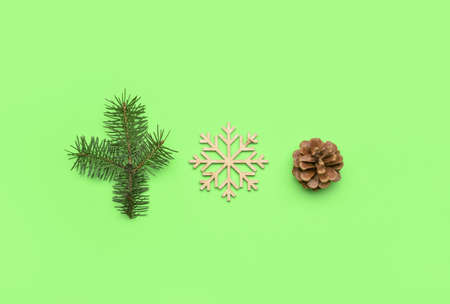 Fir tree branch, snowflake and pine cone on green background