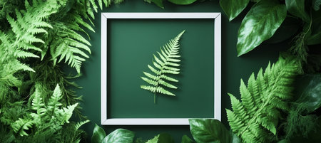 Green Tropical Fern Leaf on Minimal Design Background, With a White Frame for Text or Design.