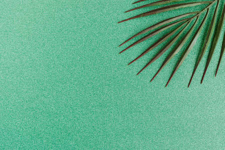 Tropical palm leaf on green glitter background. Copy space for the text