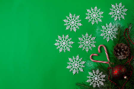 christmas tree and decorations, top view, on a green background, snowflakes and lollipop, cane light in claus