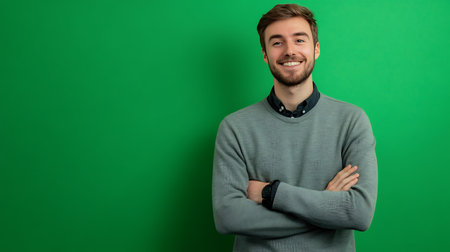 Handsome caucasian man portrait isolated on green studio background with copyspace