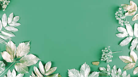 Winter concept flat lay with golden and silver leaves, copy space. Top view