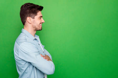 Profile photo of amazing business guy in excited mood with crossed hands looking empty space listen chief speech wear casual denim shirt isolated green color background