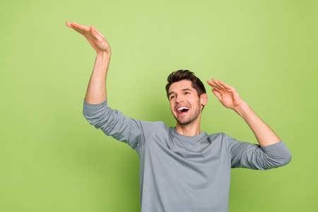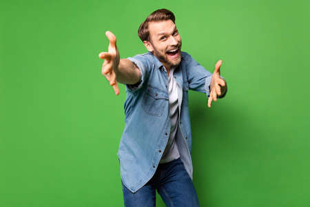 Photo portrait of overjoyed man keeping hands forward missing friend isolated bright green color background