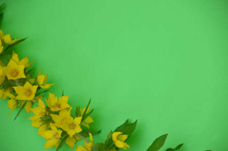 Amazing grunge background with Yellow flowers bells on green texture. Beautiful Colorful Greeting Card for Mothers Day, Birthday, March 8, easter. Top view, Flat lay. Horizontal Image With Copy Space