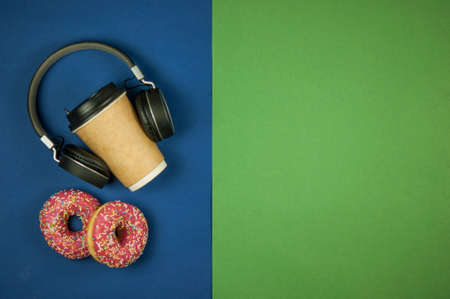 A paper coffee cup with two donuts and wireless headphones lie on a green and blue background. A place to copy. Top view. Audiobook concept. Distance learning. Close-up, copy the space, the background