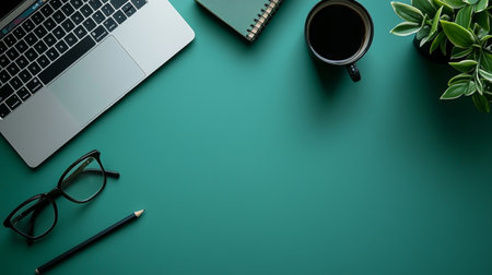 A minimalist desk setup featuring a laptop, coffee cup, notebook, and plant, on a green background, symbolizing productivity and modern workspaces.