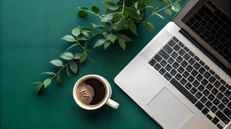 Flat lay photography of a laptop. plant and coffee cup on a dark green background. AI generated photo. 4K. HD Image Background