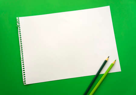Blank sheet of paper space for design and lettering on a beautiful green background blue pencils. Perforated sheet torn from notepad obliquely lying on the surface. square sheet of paper. copyspace