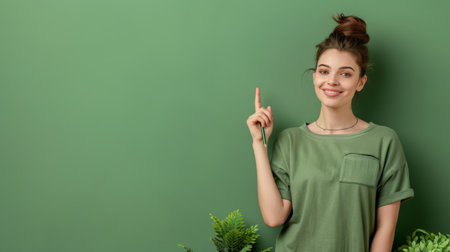Young woman in green shirt pointing upwards with a smile against a green background. Concept for ideas, inspiration, and positive thinking.