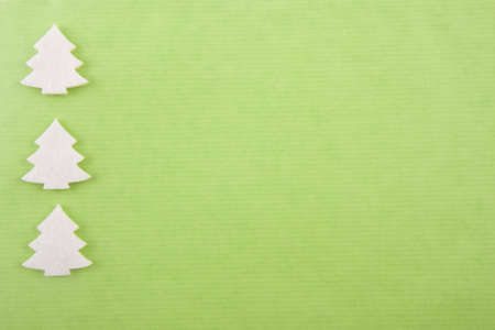 Three beautiful handmade wooden fir trees on the green background with the space for your design. Christmas or New Year decoration banner.