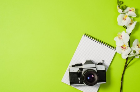 Flat lay photo of a creative freelancer woman workspace desk with copy space background. Image taken from above, top view. Minimal style with colorful paper backdrop and flowers