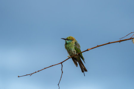 Fluffed-up Asian green bee-eater or Merops orientalis on a small high branch against claer blue sky in Yala National Park Sri Lanka.