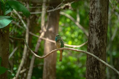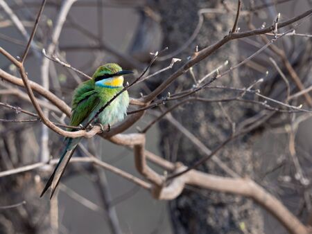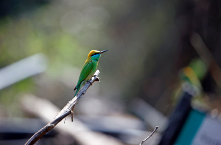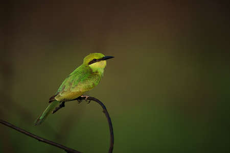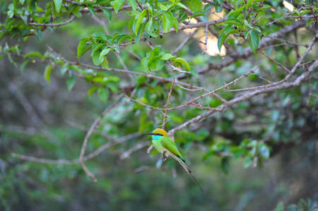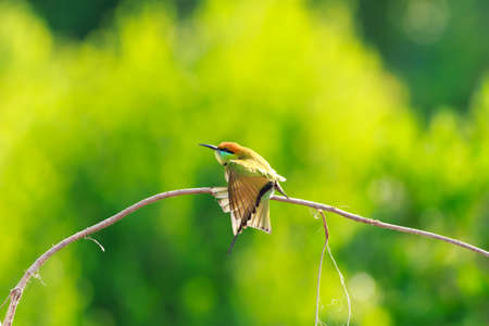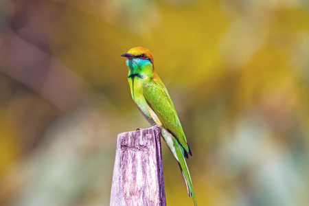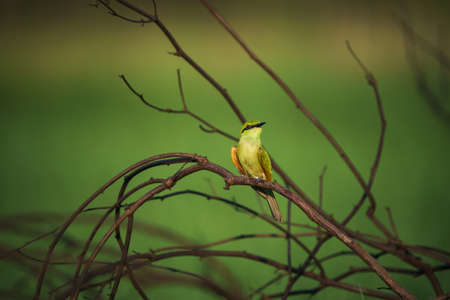 Yellow green bee eater little bird sitting on a branch in the sun, Vietnam.
