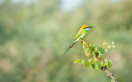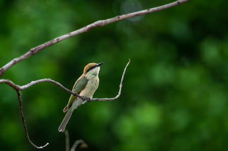 Green Bee-Eater perching on perch looking into a distance with blur green background