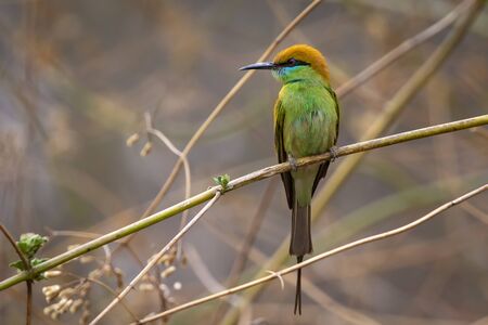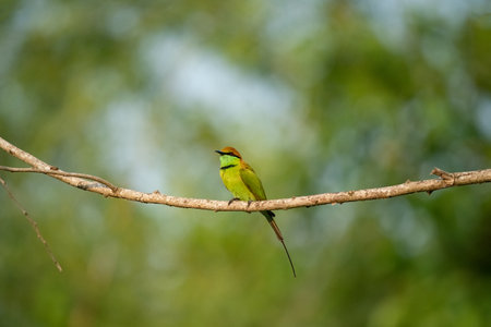 Green bee-eater (Merops orientalis), also known as little green bee-eater. Bee eater sitting on a branch in Udawalawe National Park. Wildlife photography and bird watching on Sri Lanka.