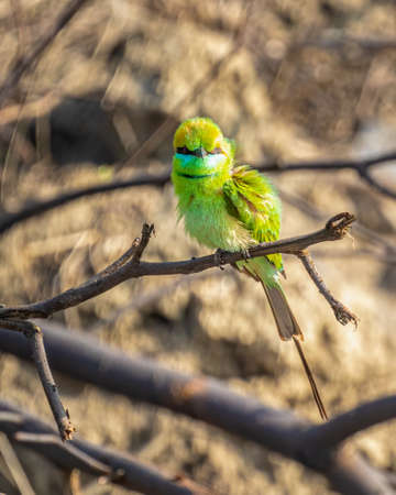 Colorful little green bee-eater bird perch on a bare tree branch, bird chirping loudly, Cute bee-eater Spotted in Yala national park, Sri Lanka.