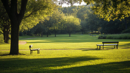A peaceful park scene with expansive grass fields, benches, and walking paths, providing a relaxing and picturesque outdoor setting.