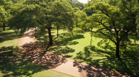 Experience the tranquility of nature with this aerial view capturing a vibrant green park filled with tall trees and a winding pathway. Perfect for outdoor enthusiasts.