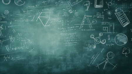 A textured chalkboard covered with intricate scientific formulas and diagrams, ideal for educational content and academic projects to inspire learning.