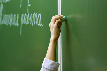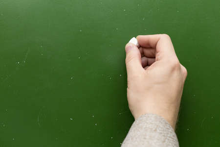 Chalkboard or green board. Hand holding white chalk writing on green board in classroom, Copy space for your text.Education concept.