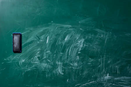 Erased and dirty class blackboard with white chalk and eraser close up. Top view