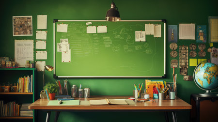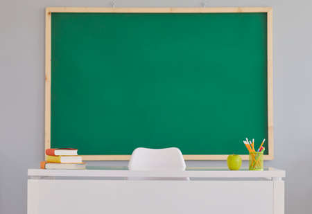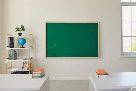 Back To School background with a clean green school board. Indoor shot of a teachers desk and a copy space blackboard in a modern school classroom. Education concept