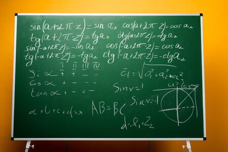 green chalkboard with mathematical formulas on orange