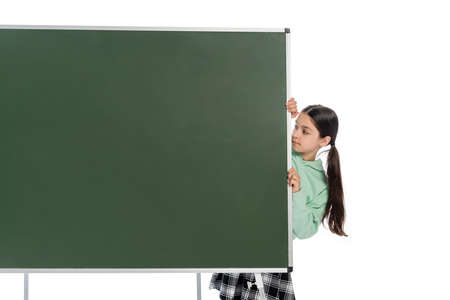 Pupil looking at green chalkboard isolated on white