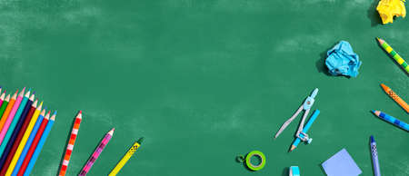 Flat lay school stationery on green chalkboard background. Back to school concept, creative layout. Top view, overhead.
