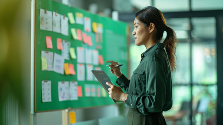 Woman using a tablet to organize sticky notes on a green board in a modern office. Creative brainstorming and planning session for project management.