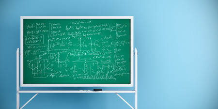 Chalkboard with mathematical formulas on blue wall background. College concept. 3D Rendering