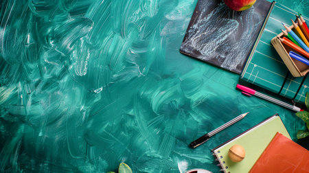 An overhead view of a vibrant teal surface featuring a collection of colorful school supplies, books, and stationery, creating an artistic collage of back-to-school essentials.
