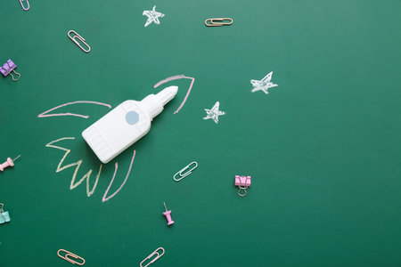 Drawn rocket with bottle of glue on green background