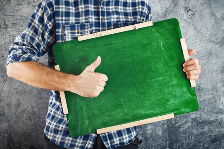 Man holding green chalkboard and showing thumb up. Empty classroom blackboard for your text.
